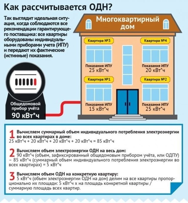 ОДН рассчитывается так. Из расхода по общедомовому прибору учёта вычитается сумма расхода по квартирным счётчикам (плюс норматив по тем квартирам, откуда показания не поступили), и получившаяся разница делится между всеми жильцами пропорционально размеру площади каждого жилого помещения (квартиры).